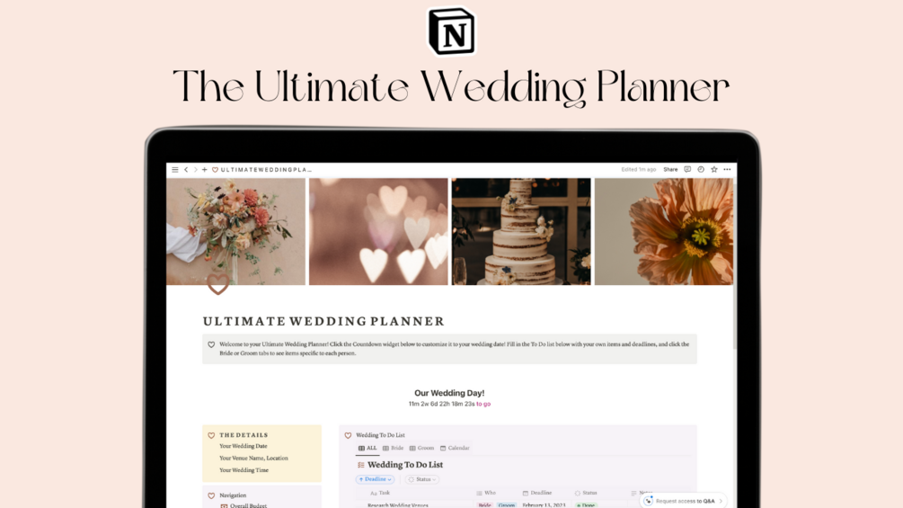 Includes the following pages: Budget, Guest List, Vendors, Itineraries, Music, Photography, Mood Boards, Links, Documents, and a Master To Do List!